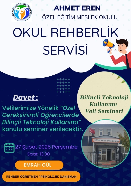 Okul rehber öğretmenimiz Emrah GÜL tarafından 27 Şubat Perşembe günü saat 13.30'da "Özel Gereksinimli Öğrencilerde Bilinçli Teknoloji Kullanımı" konulu veli seminerimiz okulumuzda verilecektir. Katılımlarınızı bekliyoruz.
